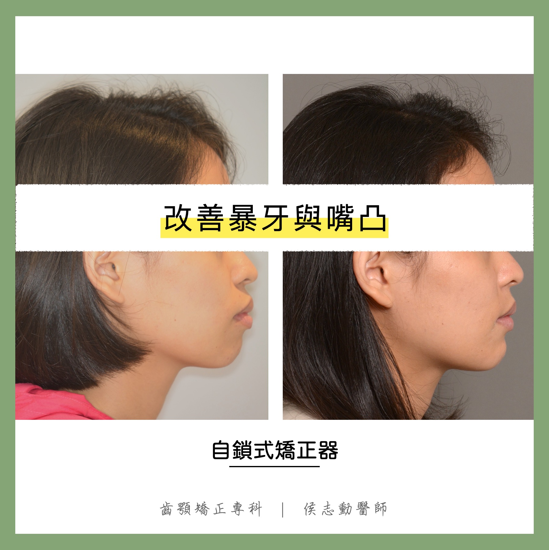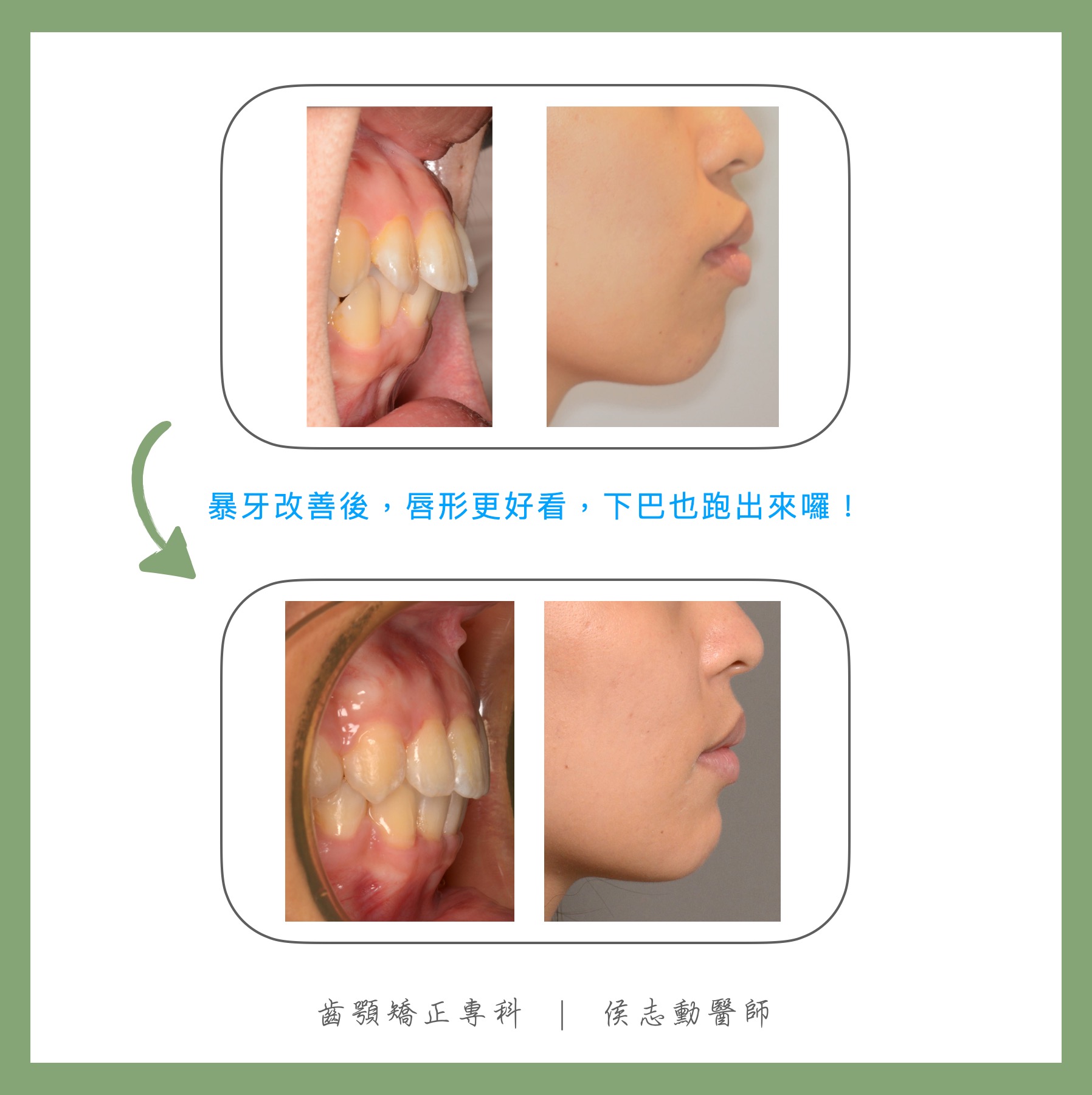 當暴牙收回、咬合正常,嘴唇位置也隨之變化,讓下巴線條更明顯、整體臉部更加立體自然。