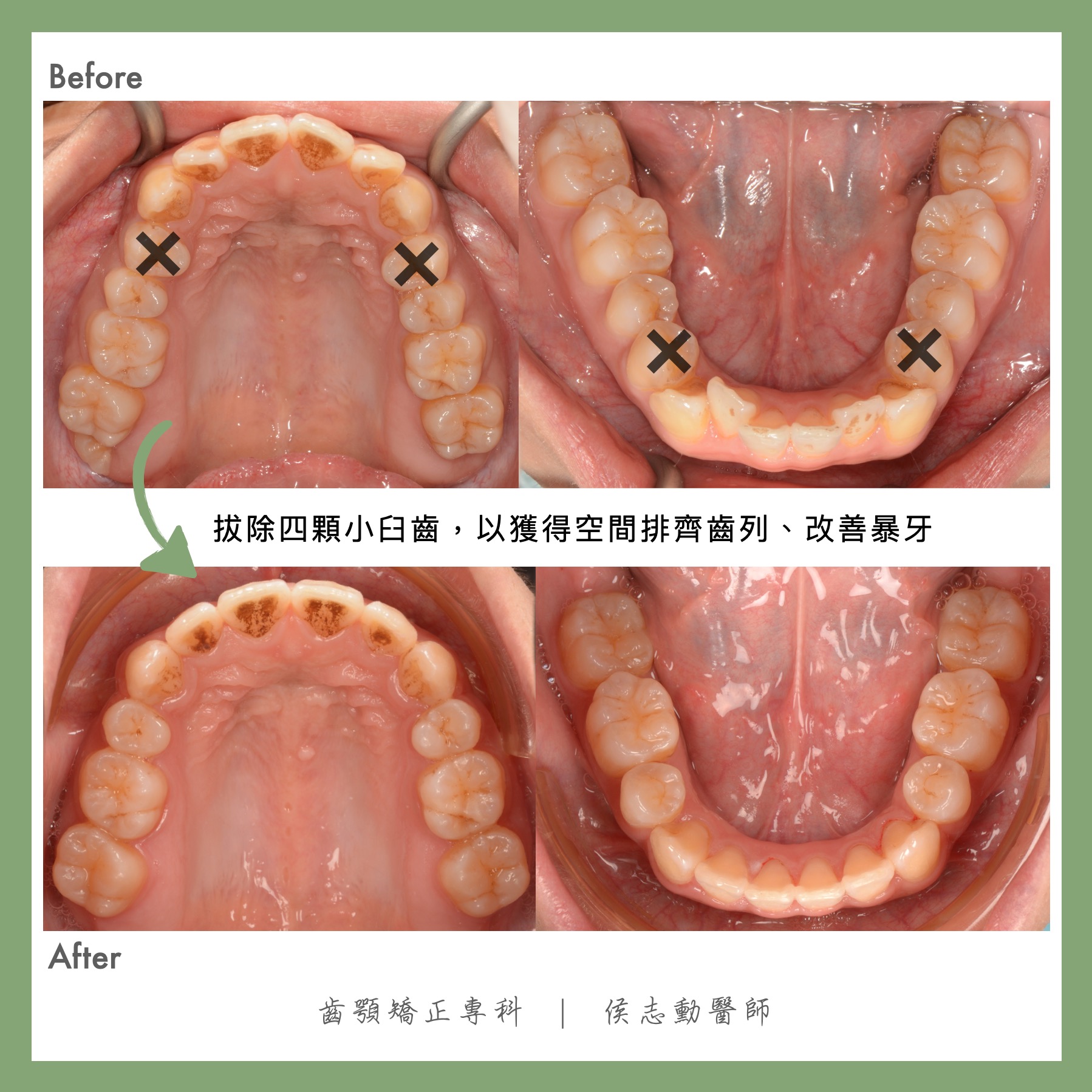 為了讓前突的門牙能順利往內收,我們安排拔除上下顎各兩顆小臼齒,騰出空間來重新排列齒列。