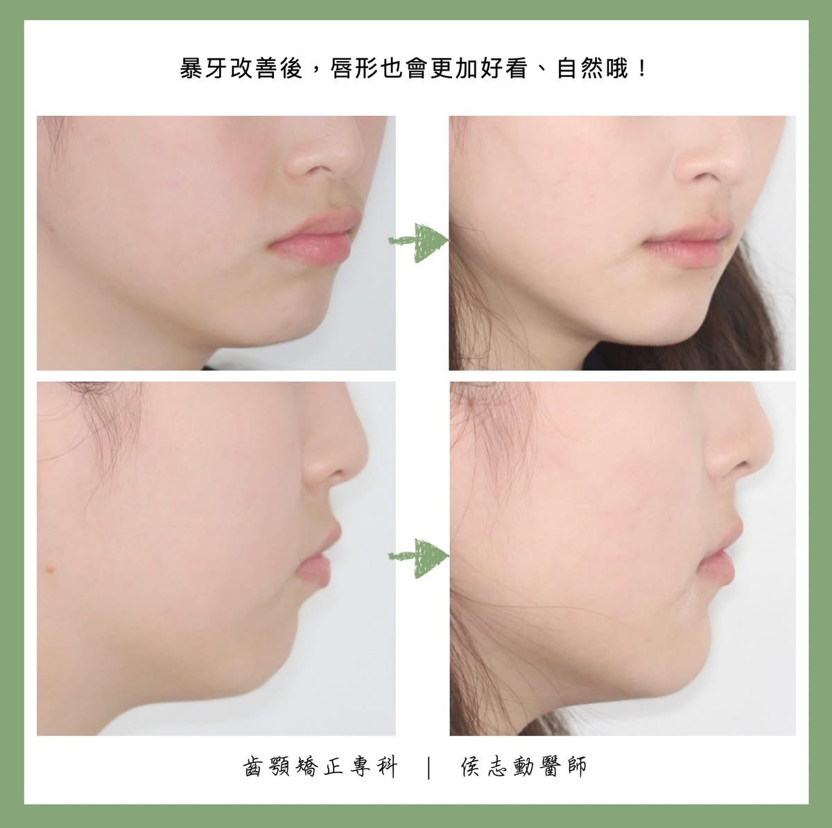 由側顱X光片的前後對比可以看出,治療後上排門牙後退許多,暴牙的狀況也大幅改善。當牙齒位置趨於理想,Y小姐的下臉部輪廓、唇形也變得更加柔和、美觀囉!