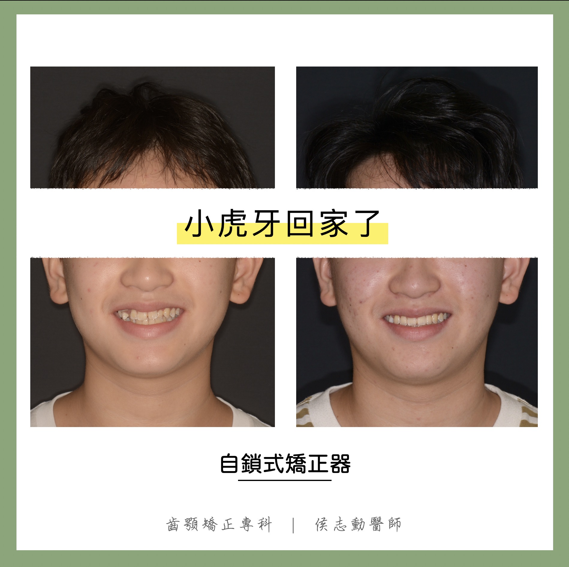 我們使用 #自鎖式矯正器 搭配 #矯正橡皮筋牽引,一步步讓犬齒回到齒列中,讓整體齒列整齊許多,也讓微笑曲線更加理想。